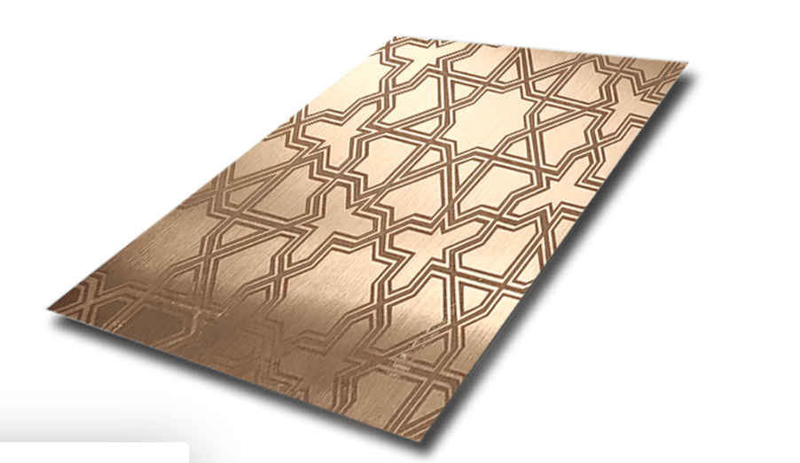 Лист декоративной нержавеющей стали удивляет изысканными рисунками. Некоторые похожи на старинные гравюры, другие – на древние рисунки египтян, выполненные жрецами на папирусе. Покрытие создается при помощи трафаретной печати. На поверхность листа наносится специальное покрытие, устойчивое к кислоте. Лист травится кислотой, которая меняет фрагменты без защитного покрытия. Благодаря этому на стали появляется рисунок.