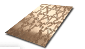 Лист декоративной нержавеющей стали удивляет изысканными рисунками. Некоторые похожи на старинные гравюры, другие – на древние рисунки египтян, выполненные жрецами на папирусе. Покрытие создается при помощи трафаретной печати. На поверхность листа наносится специальное покрытие, устойчивое к кислоте. Лист травится кислотой, которая меняет фрагменты без защитного покрытия. Благодаря этому на стали появляется рисунок.