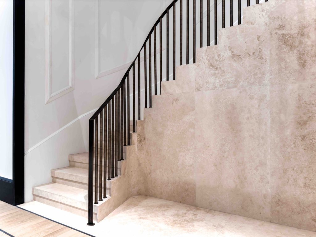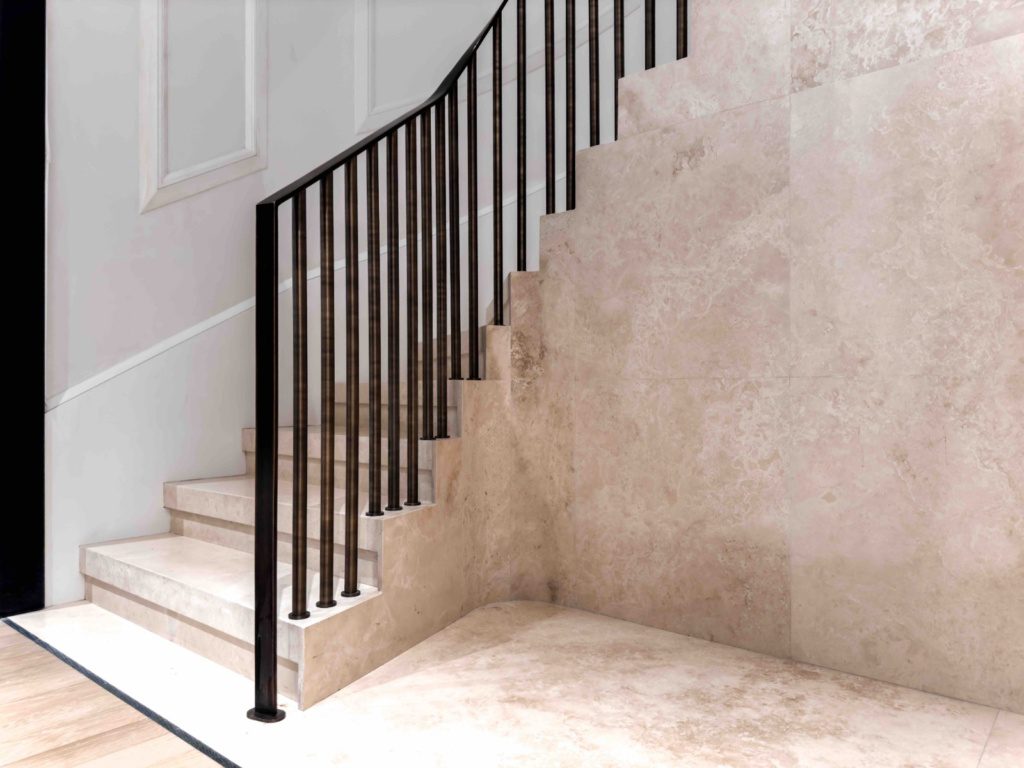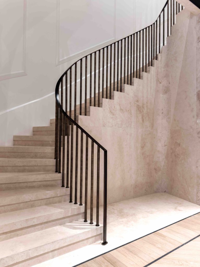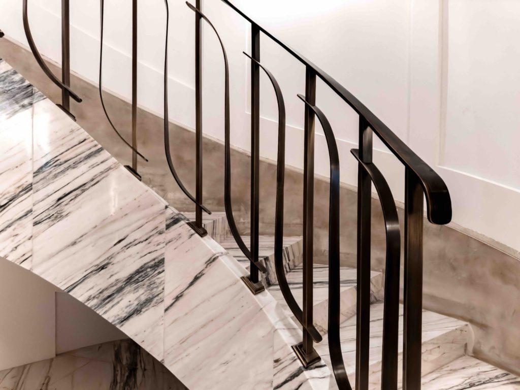 Для лестничных ограждений общественных зон BVLGARI HOTEL&Residences, Москва архитекторы Antonio Citterio Patricia Viel выбрали тощину для балясин: 10х50 мм и для поручня 15х50 мм Естественно, лестничное ограждение со скрытым креплением. Для скрытого крепления мы разработали специальную конструкцию из нержавеющей стали. Нами были смонтированы закладные в бетон, до монтажа мрамора ступеней и облицовки. Сборку делали секциями по пролетам , с тем, чтобы на объекте только нужно было только одеть секцию на закладные. Разработка этой конструкции позволила избегать сварки в местах соединений, отдельно патинировать все части сборного ограждения лестницы.