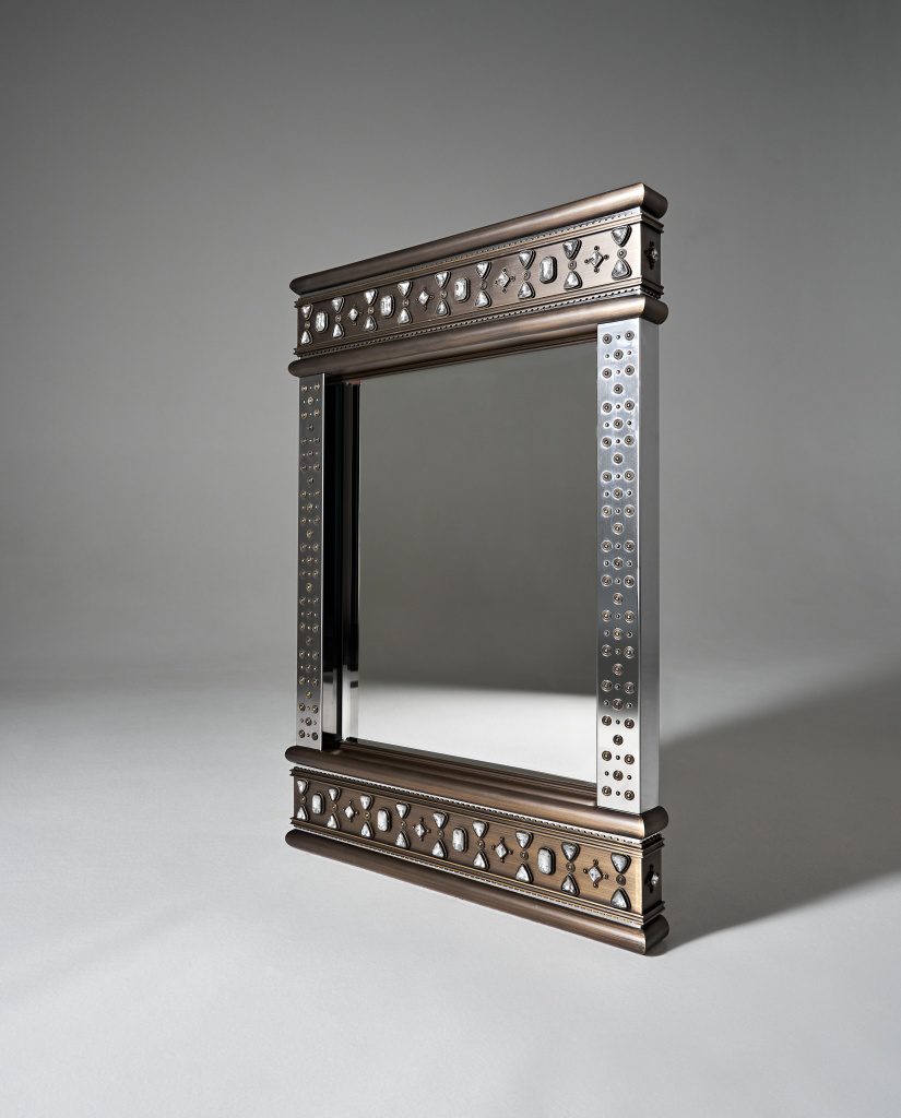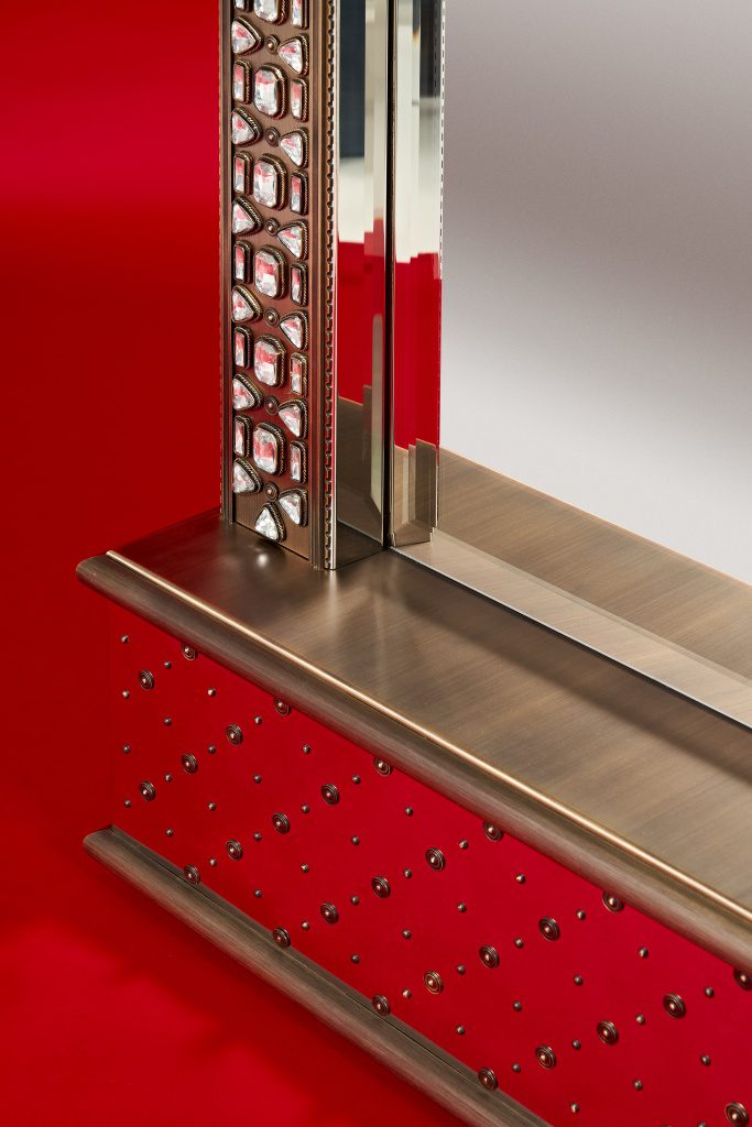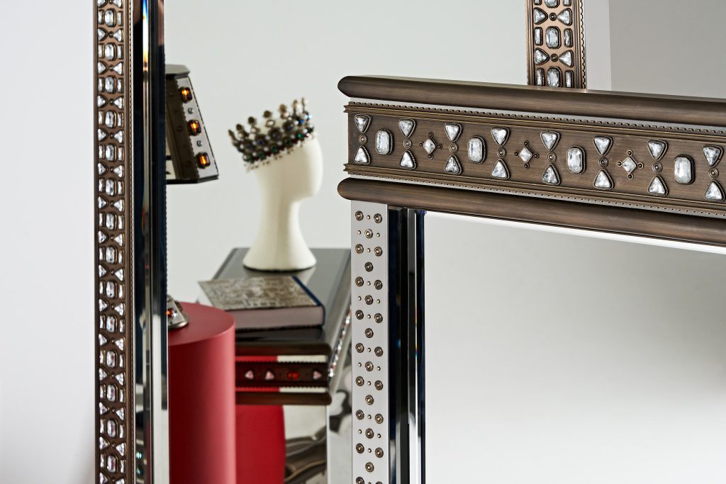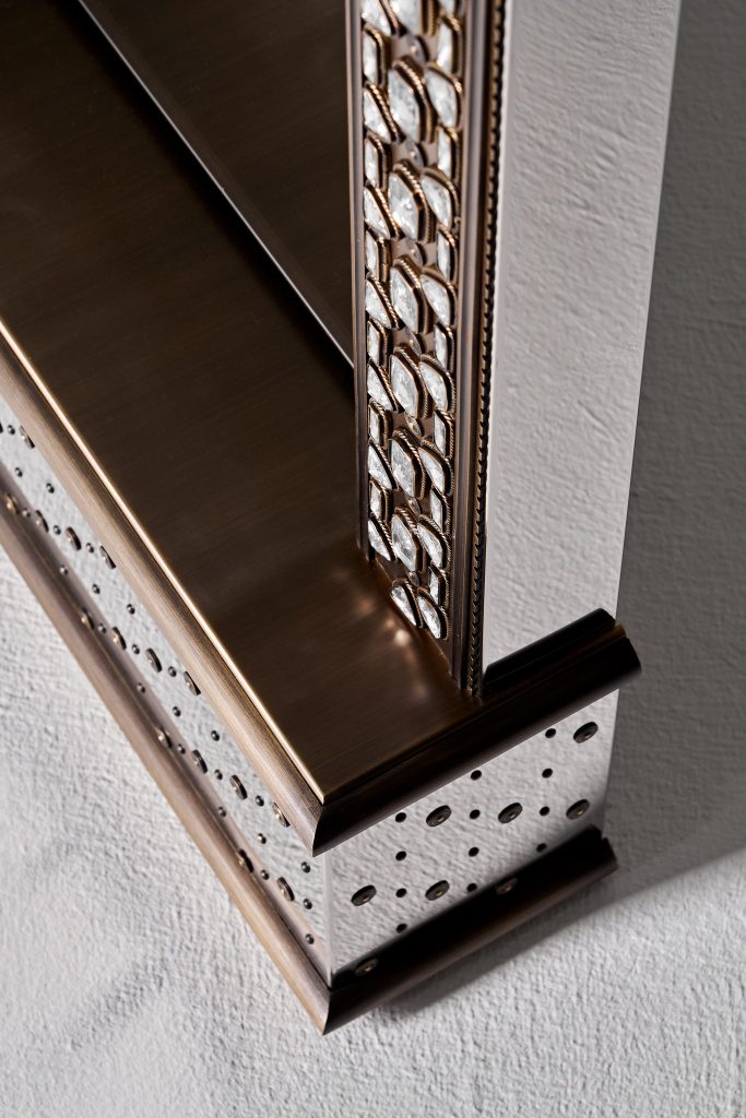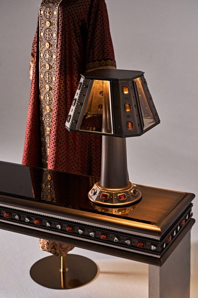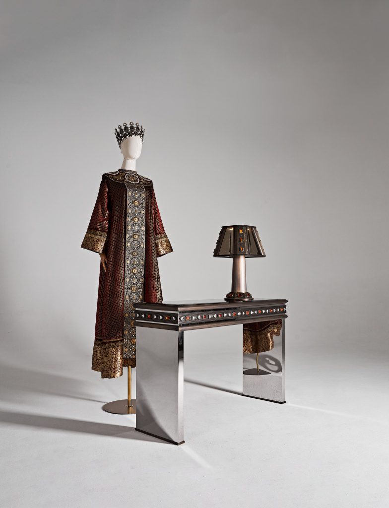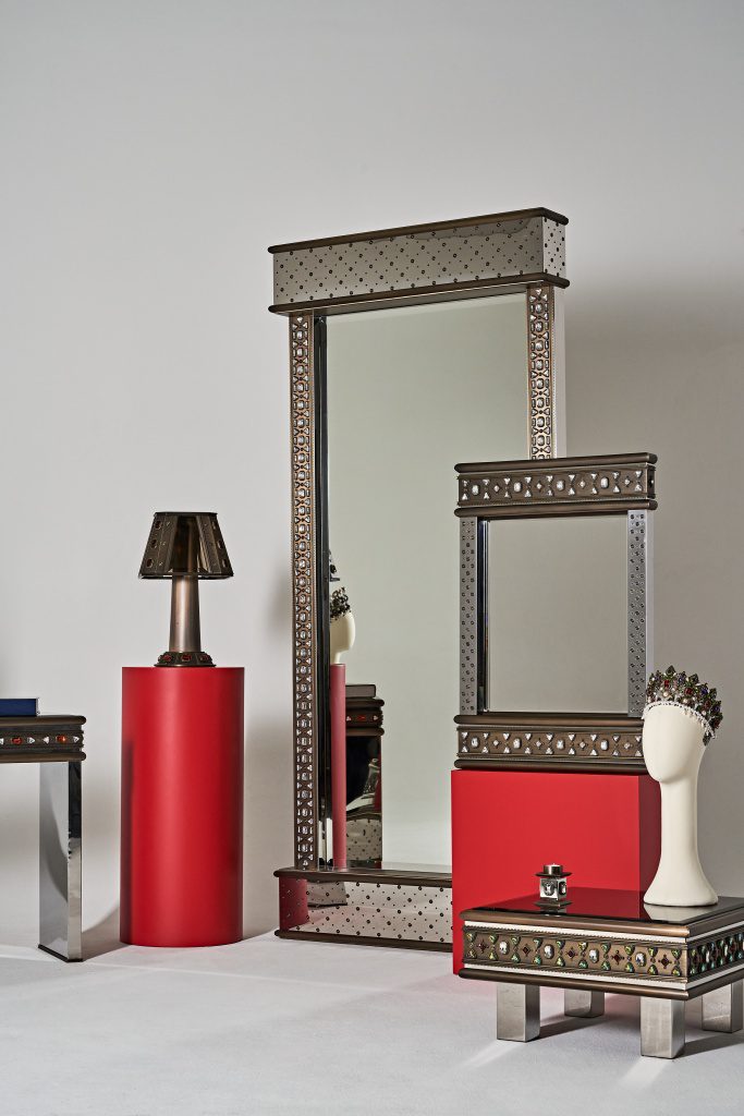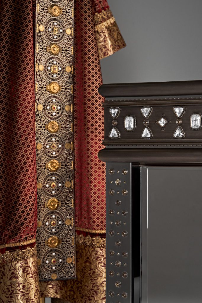 Совместно с художником коллекции Евгением Вавиловым (автором драгоценных окладов, хоросов, кадил, крестов, иконостасов) мы постарались отразить своё видение византийских ювелирных техник в предметах интерьера. В капсуле представлены два зеркала (напольное и настенное), консоль, настольная лампа, журнальный столик.