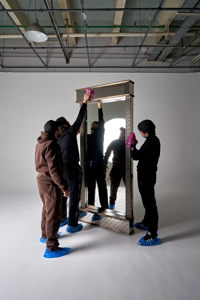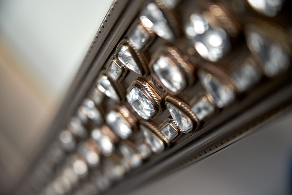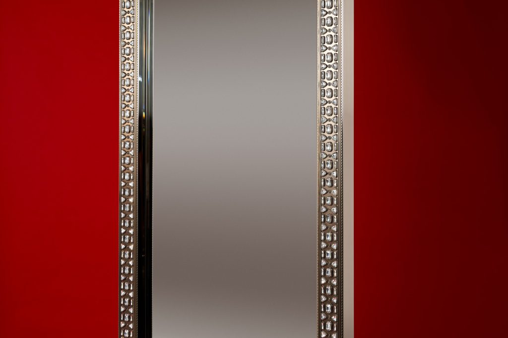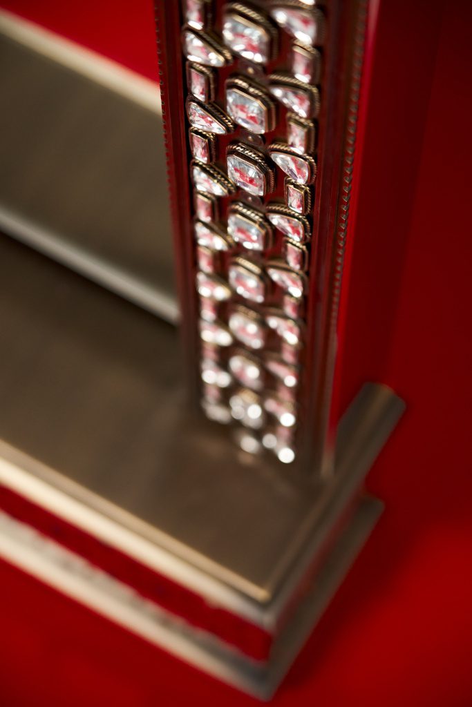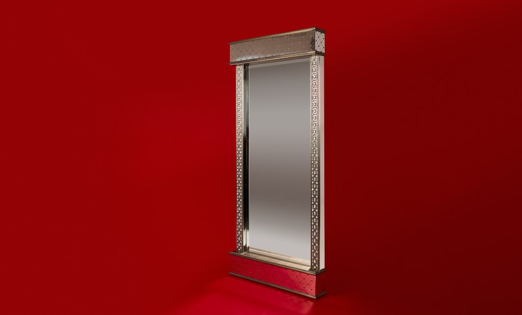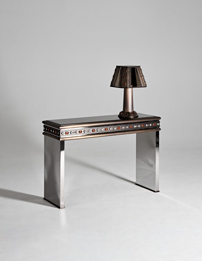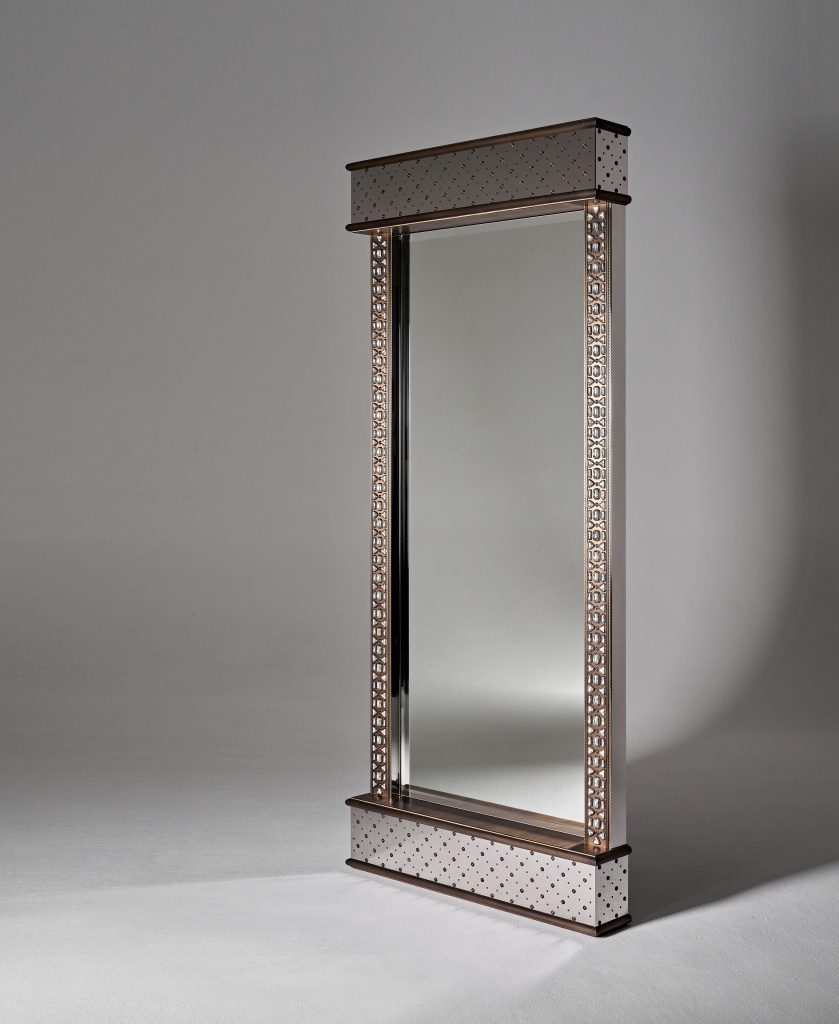 Совместно с художником коллекции Евгением Вавиловым (автором драгоценных окладов, хоросов, кадил, крестов, иконостасов) мы постарались отразить своё видение византийских ювелирных техник в предметах интерьера. В капсуле представлены два зеркала (напольное и настенное), консоль, настольная лампа, журнальный столик.