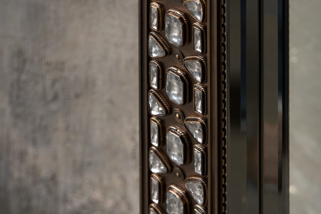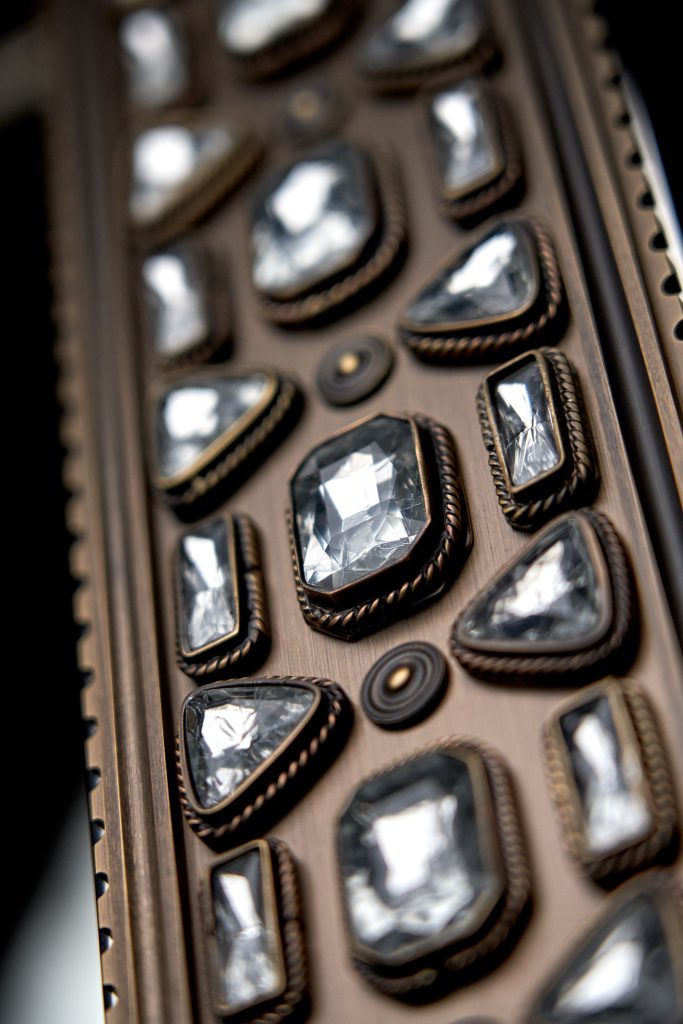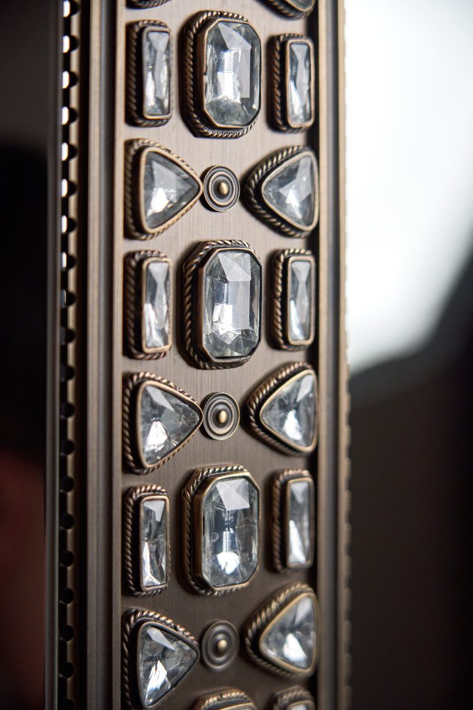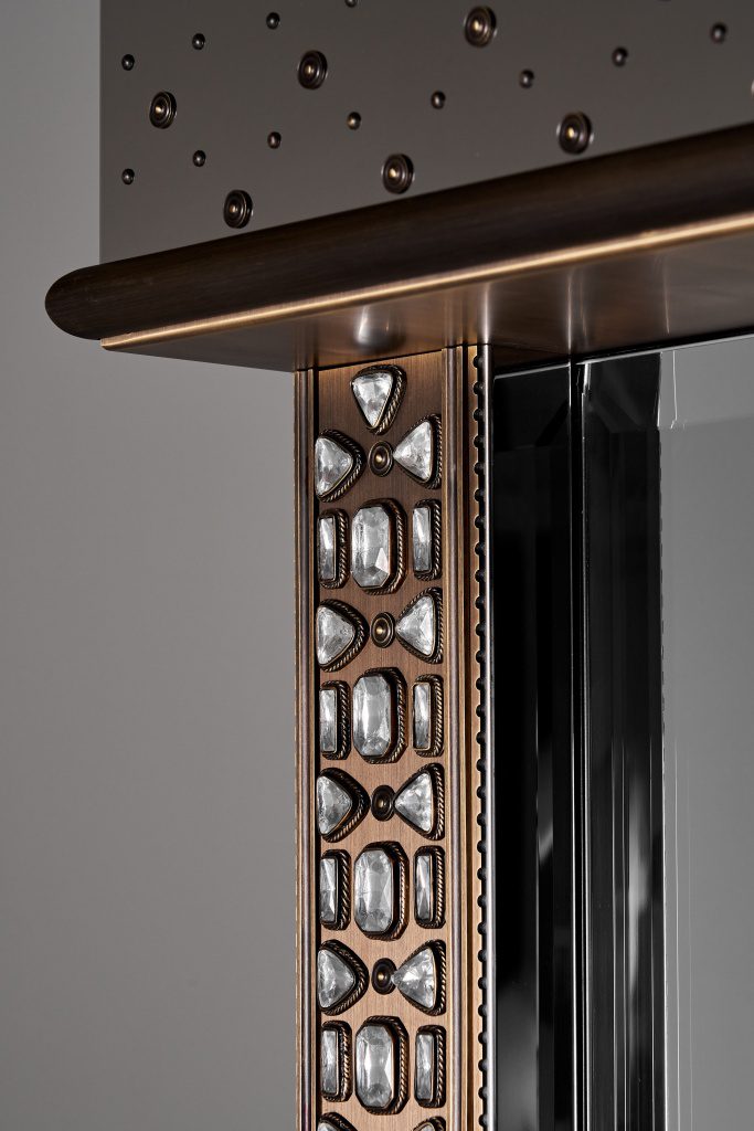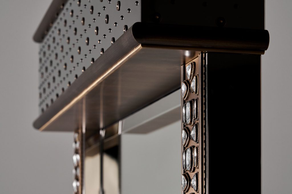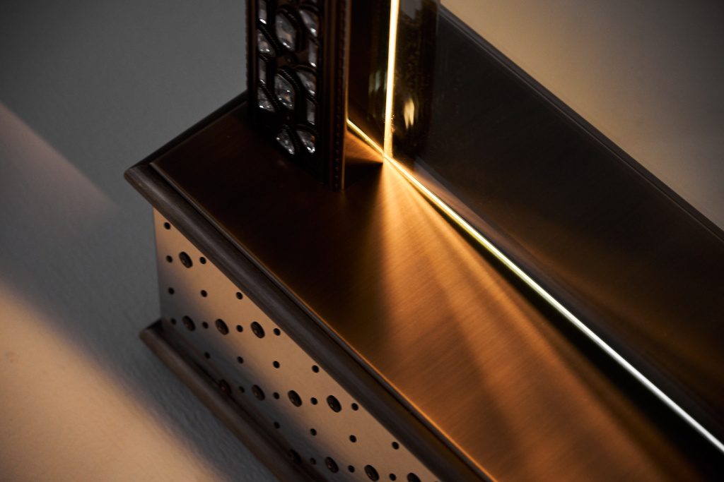Патинированная и сатинированная латунь, элегантные растительные орнаменты из тончайшей латунной проволоки, обрамляющей кристаллы, филигранные узоры, касты с декоративным обрамлением — каждый элемент выполнен вручную московскими мастерами.