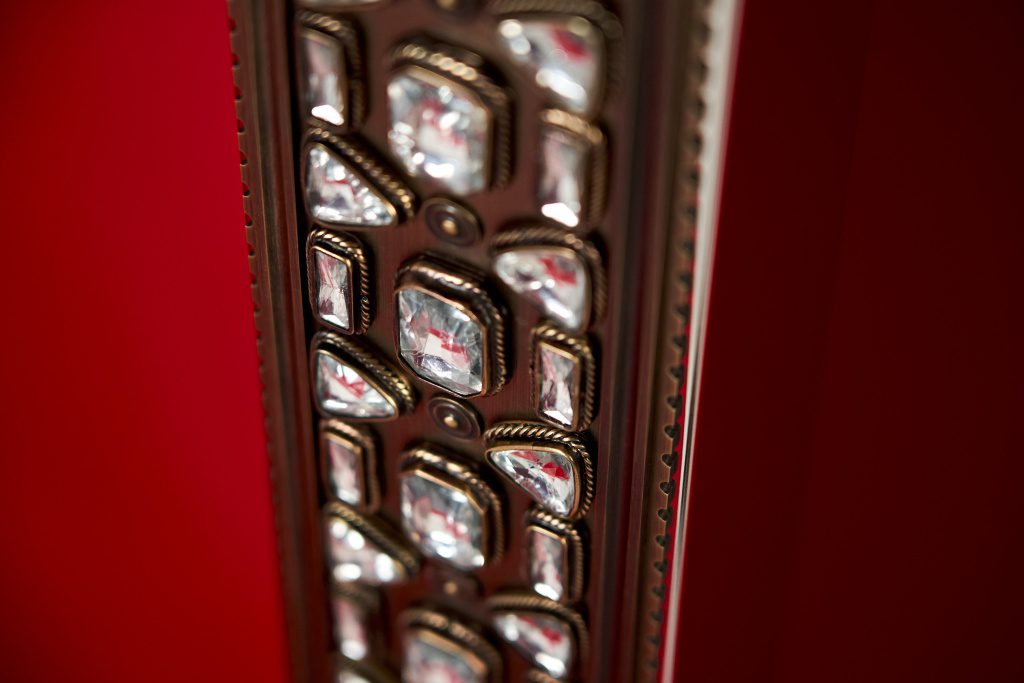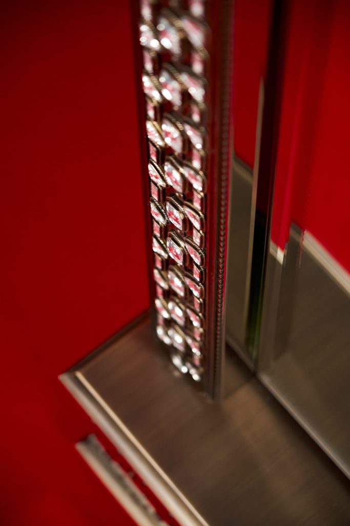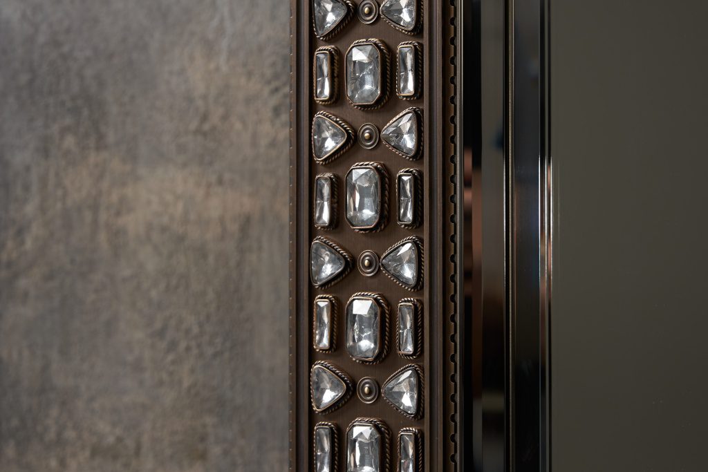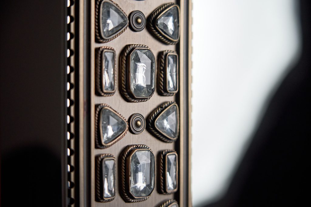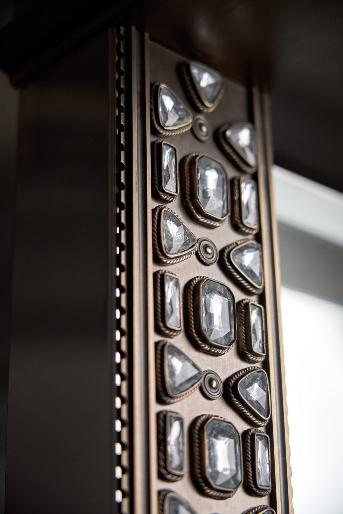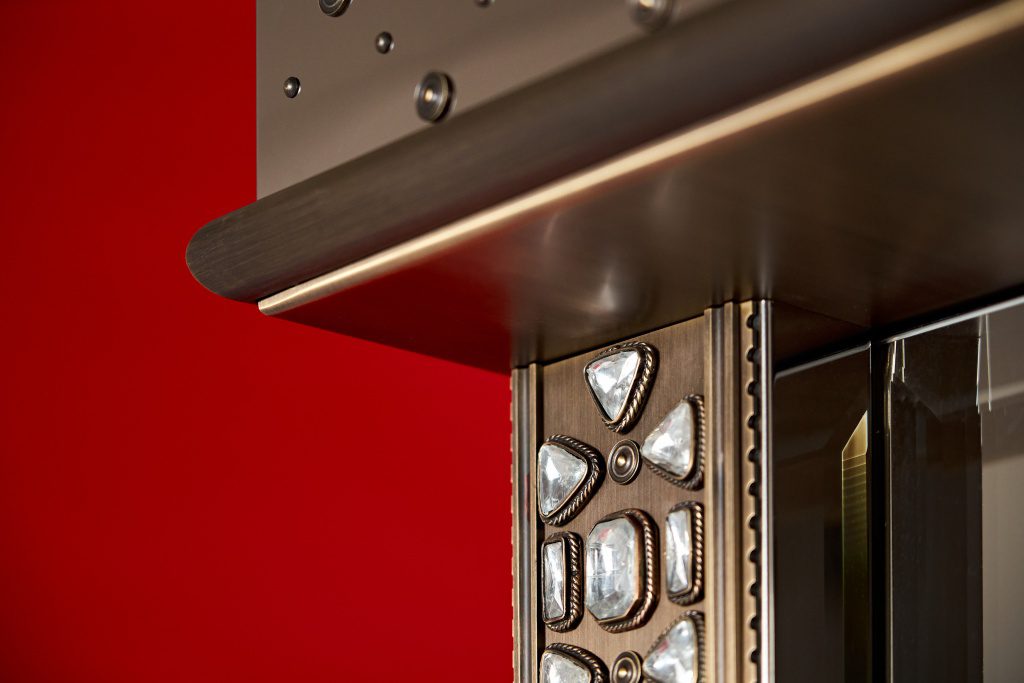 Патинированная и сатинированная латунь, элегантные растительные орнаменты из тончайшей латунной проволоки, обрамляющей кристаллы, филигранные узоры, касты с декоративным обрамлением — каждый элемент выполнен вручную московскими мастерами.