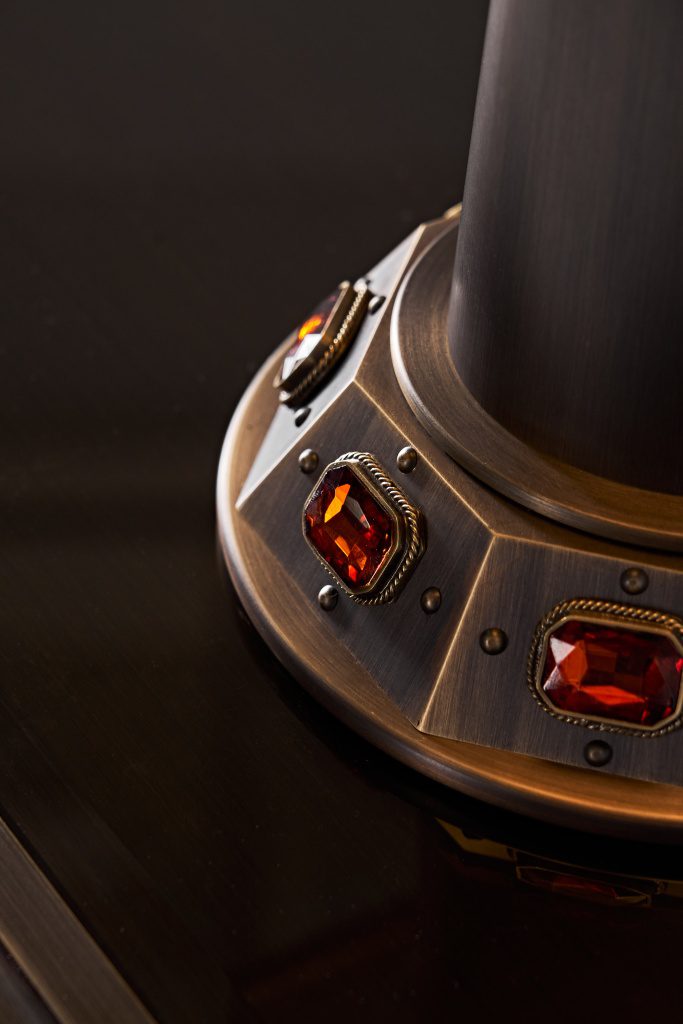Патинированная и сатинированная латунь, элегантные растительные орнаменты из тончайшей латунной проволоки, обрамляющей кристаллы, филигранные узоры, касты с декоративным обрамлением — все эти элементы выполнены вручную московскими мастерами.