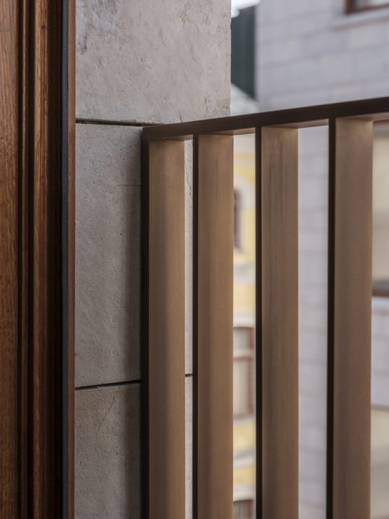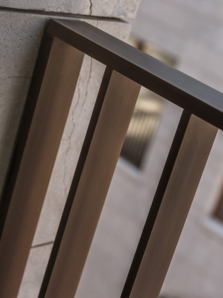 Для изготовления ограждений была выбрана латунь. Но сияющий, словно золотой самородок, металл был бы неуместен в самом сердце Москвы. Слишком яркий блеск не вписался бы в архитектуру района. Именно поэтому мы подвергли металл дополнительной обработке и использовали сатинированную латунь. Обработка «сатин» приглушает блеск металла, добавляя ему утонченную элегантность и аристократическое благородство. Помимо сатинирования поверхность металла была дополнительно обработана и покрыта декоративной патиной. Этот штрих сделал латунь еще более изысканной. Патинированная латунь приобретает особый шарм. Ограждения стали выглядеть так, словно их создали не вчера, а несколько столетий назад. Металл буквально пропитался историческим духом центра столицы. Сатинированная и патинированная латунь великолепно гармонирует с окнами из ценных пород дерева.